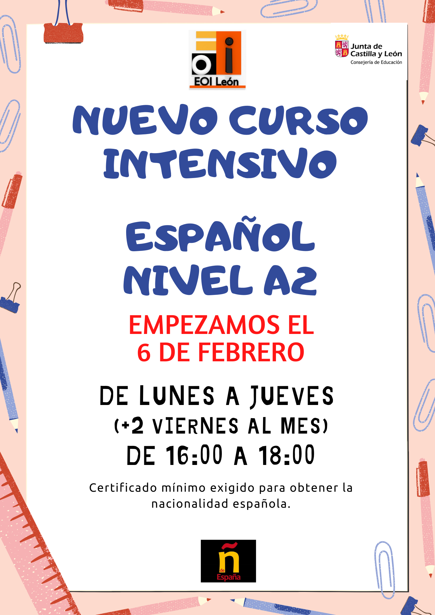 Curso Intensivo A2 de Español Lengua Extranjera, comienzo : 6 de febrero, pásate por la secretaría de la EOI León para matricularte.