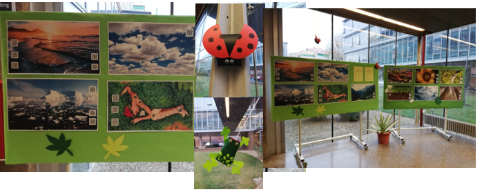 Un grupo de alumnos de inglés y alemán han recitado textos breves encarnando diferentes elementos de la naturaleza. Los textos invitan a reflexionar sobre nuestros actos y nuestra relación con la naturaleza. Al mismo tiempo, se trata de una práctica de pronunciación que parte de la imitación a actores y actrices famosos para trabajar la articulación, el ritmo y la entonación. Estas grabaciones, convertidas en códigos QR, están expuestas junto con fotografías en el hall para que todos puedan escucharlas.