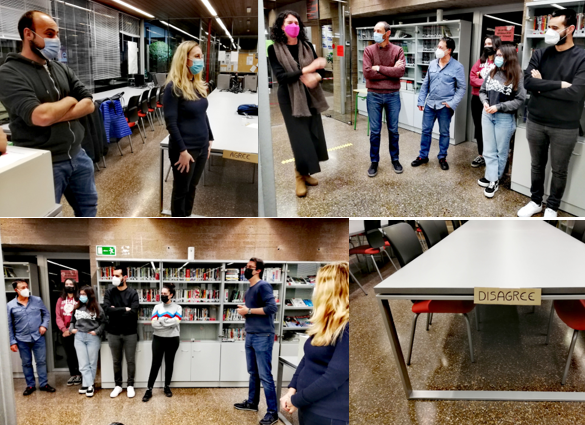 We created two areas in the library (we needed more space than usual), one for Agreement and one for Disagreement. The students had to choose their position according to their views on the controversial statements read by the teacher. In this way everybody had to come up with arguments to stand their ground. There were quite a few laughs and lots of practice.